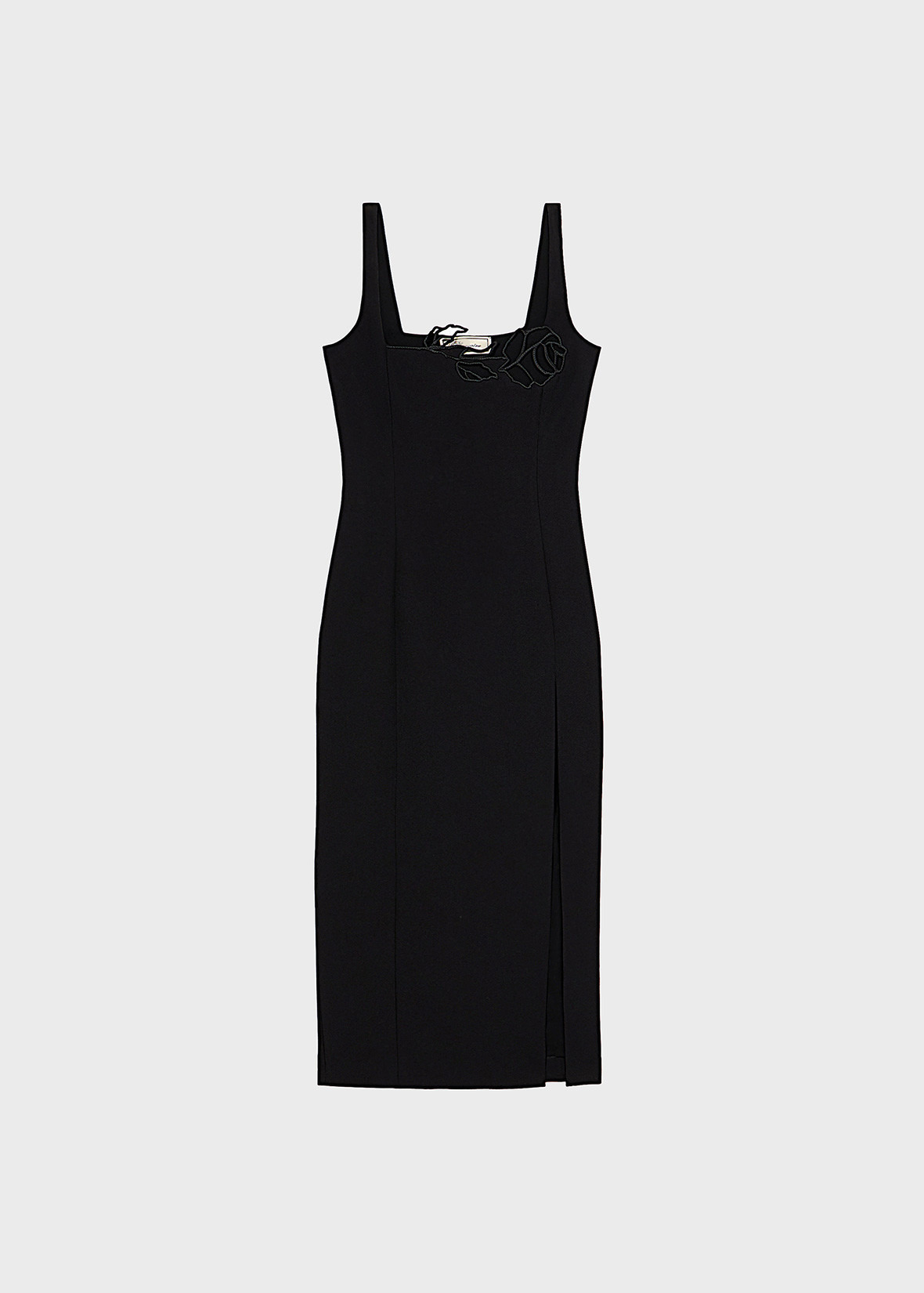 A LASER-CUT EMBROIDERED ROSE DECORATES THE DECOLLETE OF THE MIDI DRESS IN CADY CREPE WITH A SQUARE NECKLINE AND SLIT ON ONE LEG. COMPOSITION: 96%PL 4%EA - CADY CREPE - LASER-CUT EMBROIDERED ROSE AT THE NECKLINE - SQUARE NECKLINE FRONT AND BACK - SLEEVELESS CUT - SHOULDER PADS - VENT AT THE LEG - FULLY LINED - MIDI-LENGTH - BODY-HUGGING FIT DETAILS COLORS: BLACK