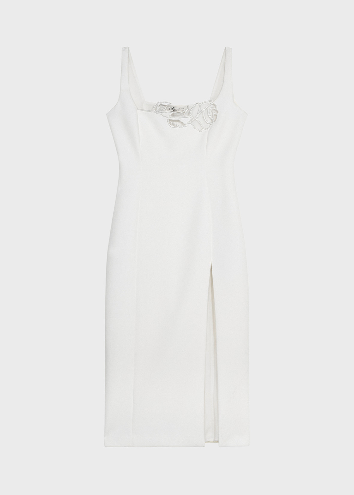 A LASER-CUT EMBROIDERED ROSE DECORATES THE DECOLLETE OF THE MIDI DRESS IN CADY CREPE WITH A SQUARE NECKLINE AND SLIT ON ONE LEG. COMPOSITION: 96%PL 4%EA - CADY CREPE - LASER-CUT EMBROIDERED ROSE AT THE NECKLINE - SQUARE NECKLINE FRONT AND BACK - SLEEVELESS CUT - SHOULDER PADS - VENT AT THE LEG - FULLY LINED - MIDI-LENGTH - BODY-HUGGING FIT DETAILS COLORS: WHITE