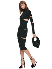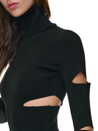 BLUMARINE dress in black, knit construction, cut-out details, high-neck, long sleeves, mid-length, form-fitting. Made in Italy Standard Sizing 70% Viscose, 30% Polyester Model is 5'9" wearing size S. Bust: 33" Waist: 24" Hip: 33"