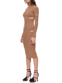 BLUMARINE dress in brown, knit construction, cut-out details, high-neck, long sleeves, mid-length, form-fitting. Made in Italy Standard Sizing 70% Viscose, 30% Polyester Model is 5'9" wearing size S. Bust: 33" Waist: 24" Hip: 33"