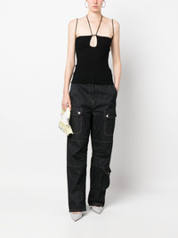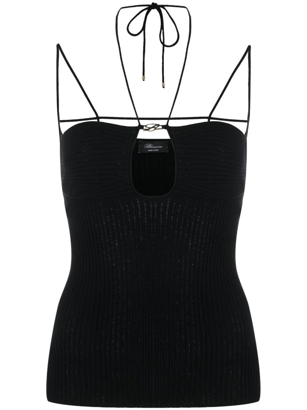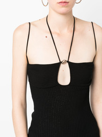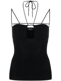 cut-out ribbed knit top Highlights - Black - Ribbed knit - Cut-out detailing - Halterneck tie fastening - Spaghetti straps - Straight hem Made in Italy Composition Viscose 100%, Polyester 100% SIZE & FIT Model measurements Height 5 ft 11 in(1.8 m) Bust/Chest 31.49 in(80 cm) Hips 36.41 in(92.5 cm) Waist 25.59 in(65 cm) FittingInformation Designed for a close fit throughout Made with a midweight knit, this piece offers some stretch This piece fits true to size – take your usual size Washing instructions Hand Wash