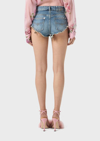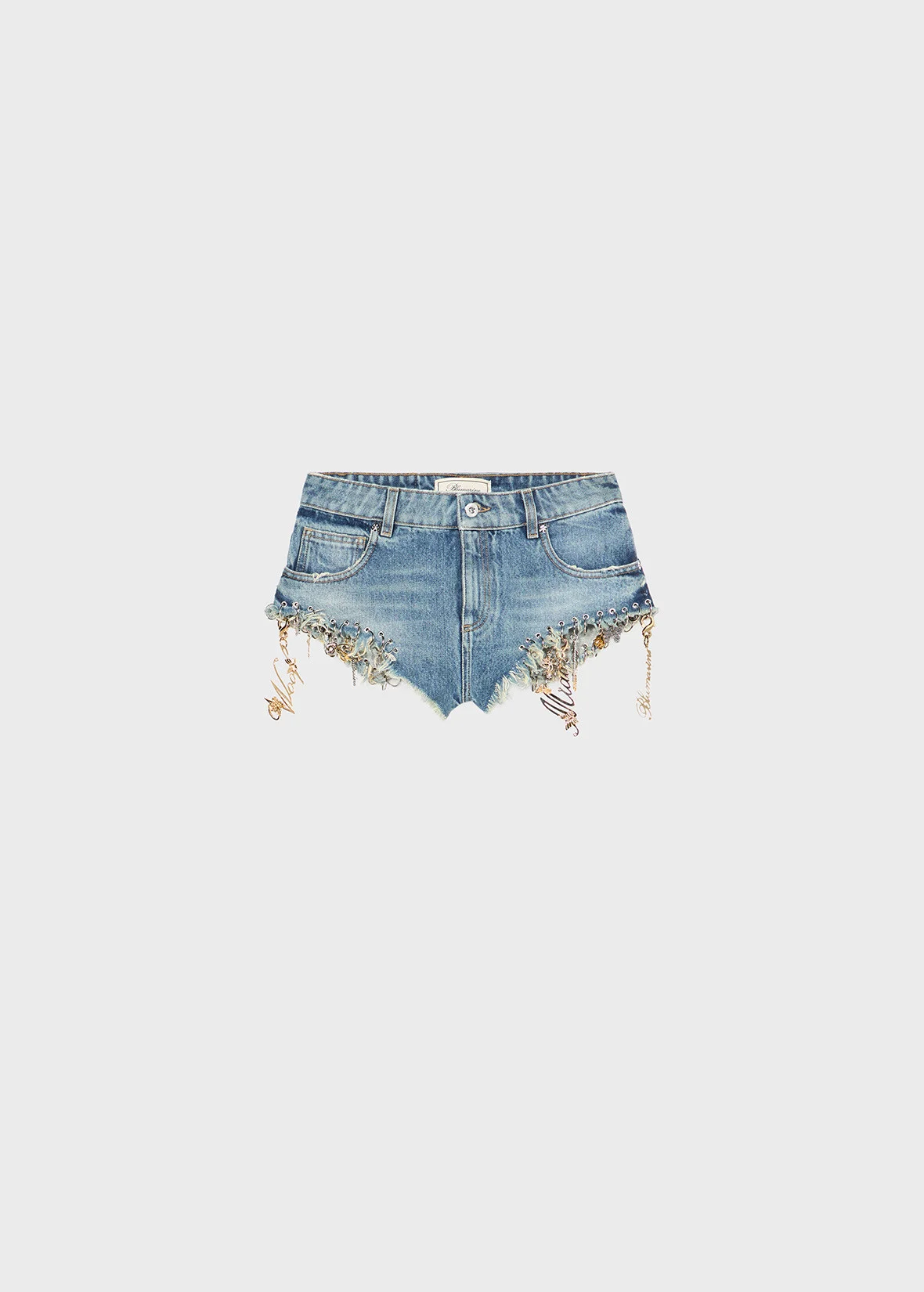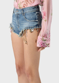 FIVE-POCKET SHORTS IN STONE-WASHED DENIM WITH FRINGES AND METAL CHARMS AT THE HEM. COMPOSITION: 100%CO - STONE-WASHED DENIM - METAL CHARMS AND SMALL RINGS AT THE HEM - FIVE-POCKET STYLE - BELT LOOPS - ZIPPER AND BUTTON CLOSURE - FRAYED BOTTOM - B MONOGRAM LABEL AT BACK - MINI LENGTH - BODY-HUGGING FIT DETAILS COLORS: BLUE