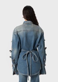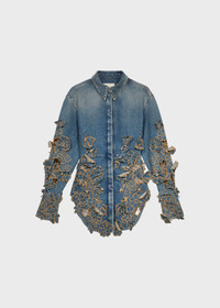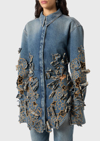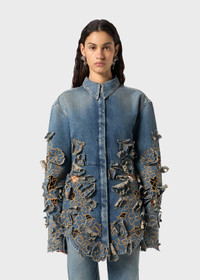 LONG DENIM SHIRT WITH INLAY FLOWER EMBROIDERY, CUTOUTS, AND 3D FLOWER APPLICATIONS. COMPOSITION: 100% CO - DENIM - INLAY FLOWER EMBROIDERY WITH CUTOUTS AND 3D FLOWER APPLICATIONS - COLLAR - LONG SLEEVES - HIGH CUFFS - WAIST CUT - HIDDEN BUTTON CLOSURE DETAILS COLORS: BEIGE, BLUE