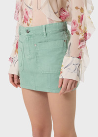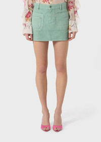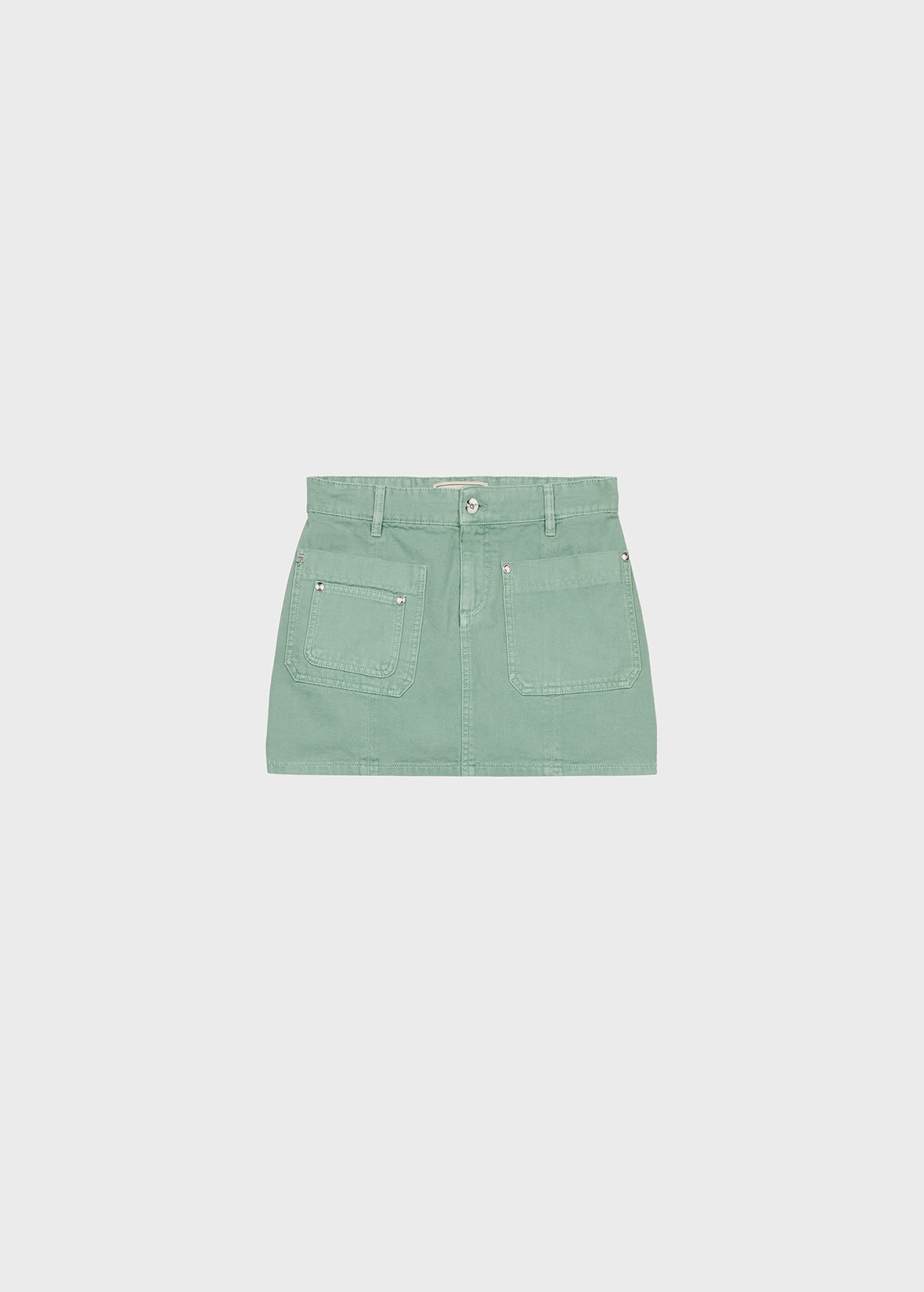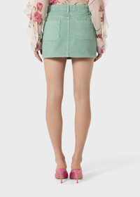 MINI SKIRT IN OVERDYED BULL FABRIC WITH APPLIQUE POCKET DETAILS. COMPOSITION: 100% CO - OVERDYED COTTON BULL FABRIC - POCKETS WITH RIVETS AT FRONT - POCKETS AT BACK - BUTTON AND ZIPPER CLOSURE - EMBROIDERED LABEL - B MONOGRAM AT BACK - MINI LENGTH - SLIM FIT DETAILS COLORS: GREEN