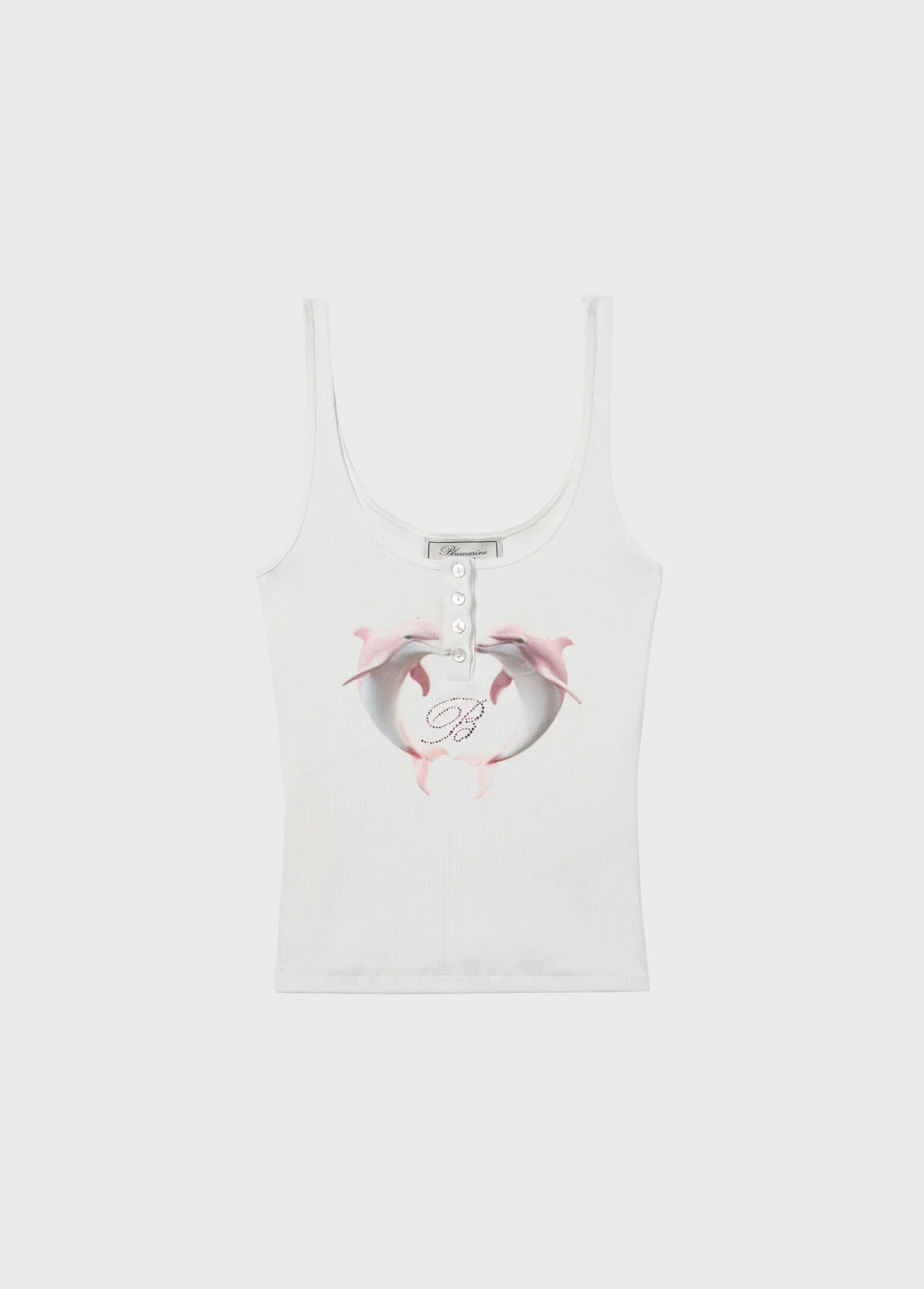 Stretch cotton ribbed top with buttons, dolphin print, and rhinestone-detailed B monogram embroidery. - Stretch cotton rib knit - Digital dolphin print - Rhinestone B monogram logo embroidery - Sleeveless - Shoulder straps - Round neck with buttons - Low neckline on the back - Body-hugging fit - Made in Italy DETAILS Composition: External fabric: 95% Cotton, 5% Elastane; Embroidery: 100% Glass Hand wash - room temperature; Do not bleach; Do not tumble dry; Iron at low temperature - without steam; Do not dry clean; Line dry in the shade; Take to a professional cleaner, but do not dry-clean; Do not use solvents; Do not rub; Wash in a mesh bag; Iron inside out; Do not iron decorations