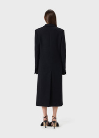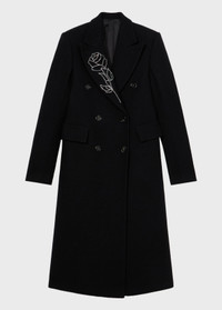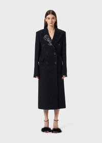 Double-breasted coat in straight-cut wool cloth with glass rhinestone rose embroidery on one lapel. - Wool felt - Glass rhinestone rose embroidery on one lapel - Double-breasted style - Straight line - Collar - Lapels - Flap pockets - Long sleeves - Buttoned cuffs - Back vent - Midi-length - Regular fit - Made in Italy DETAILS To find the correct size for you, please consult the Size Guide. Composition: Main fabric: 70% wool, 30% polyamide; Main lining: 52% acetate, 48% viscose; Fabric 2: 50% viscose, 50% wool; Embroidery: 100% glass Do not wash; Do not bleach; Do not tumble dry; Iron at low temperature - no steam; Dry clean with tetrachloroethylene or hydrocarbons - gentle cycle; Protect trims when cleaning; Clean inside out; Iron inside out; Do not iron trims