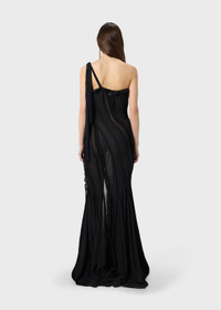 LONG VISCOSE CREPE JERSEY DRESS WITH RAW-CUT INLAYS, STRAIGHT NECKLINE, ONE-SHOULDER RUFFLE STRAP, FRONT SLIT, AND SHORT TRAIN. COMPOSITION: 100%VI - VISCOSE CREPE JERSEY - SPIRAL RAW-CUT INLAYS - STRAIGHT NECKLINE - SLEEVELESS CUT - ONE RUFFLED SHOULDER STRAP - FRONT VENT - TRAIN AT BACK - FLOOR-LENGTH - BODY-HUGGING FIT DETAILS COLORS: BLACK