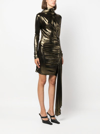 draped metallic long-sleeve dress Highlights - Gold-tone - Draped design - Metallic finish - Wrap design - Mock neck - Long sleeves - Fitted waistline - Thigh-length - Asymmetric hem Made in Italy Composition Viscose 100% SIZE & FIT Model measurements Height 5 ft 10 in(1.77 m) Bust/Chest 31.1 in(79 cm) Hips 35.03 in(89 cm) Waist 23.62 in(60 cm) FittingInformation Designed for a close fit throughout Made from a midweight non-stretch fabric, this piece offers minimal elasticity when worn Washing instructions Dry Clean Only
