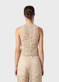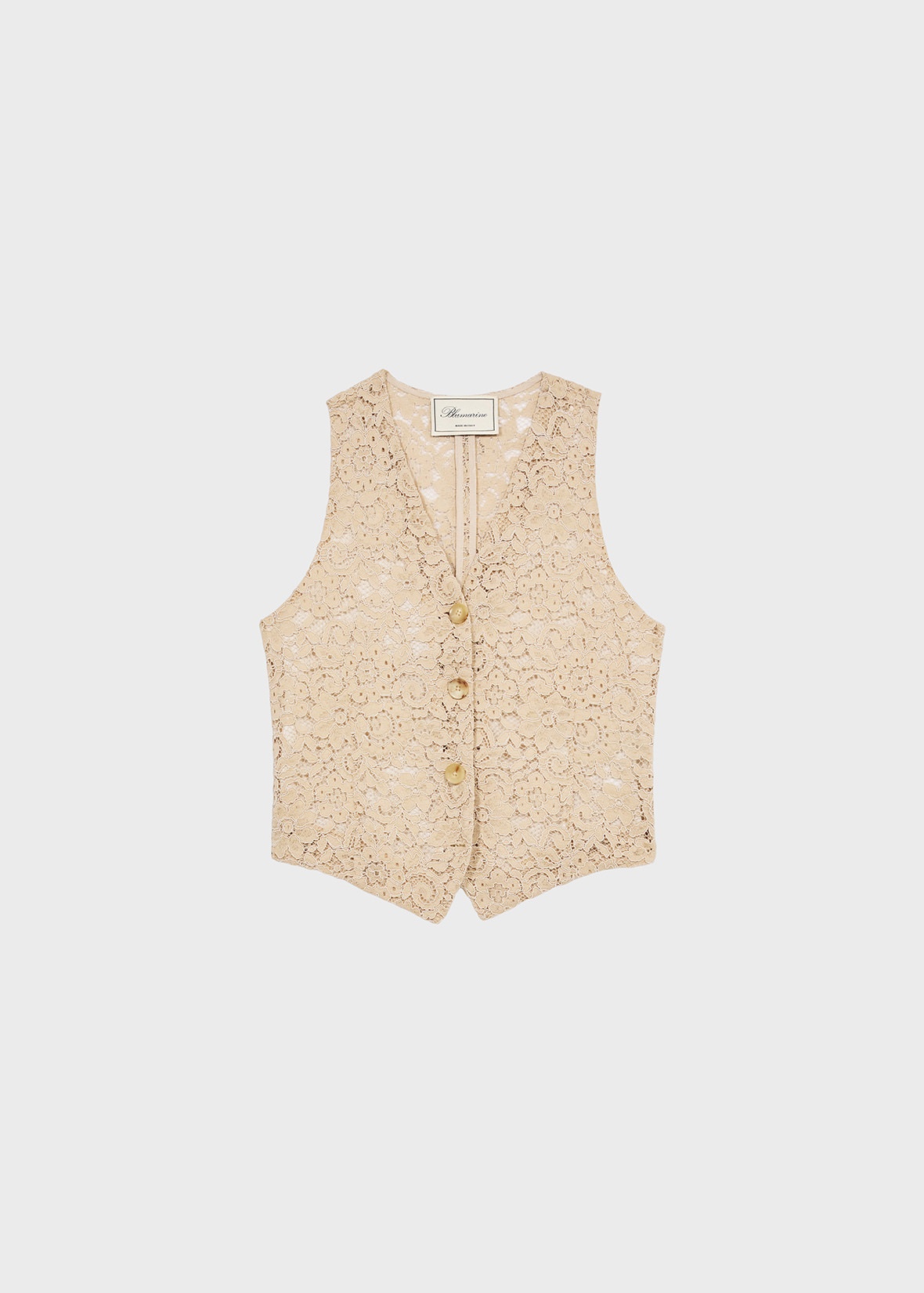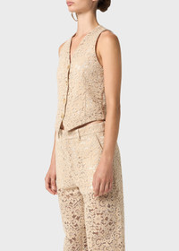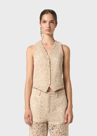 REBRODE LACE VEST WITH CONTRAST LINING, THREE-BUTTON CLOSURE AND POINTED HEM. COMPOSITION: 60%CO 40%PA - COTTON BLEND REBRODE LACE - V-NECK - SLEEVELESS CUT - BUTTON CLOSURE - PEAKED LAPELS - CONTRAST LINING - REGULAR FIT DETAILS COLORS: BEIGE