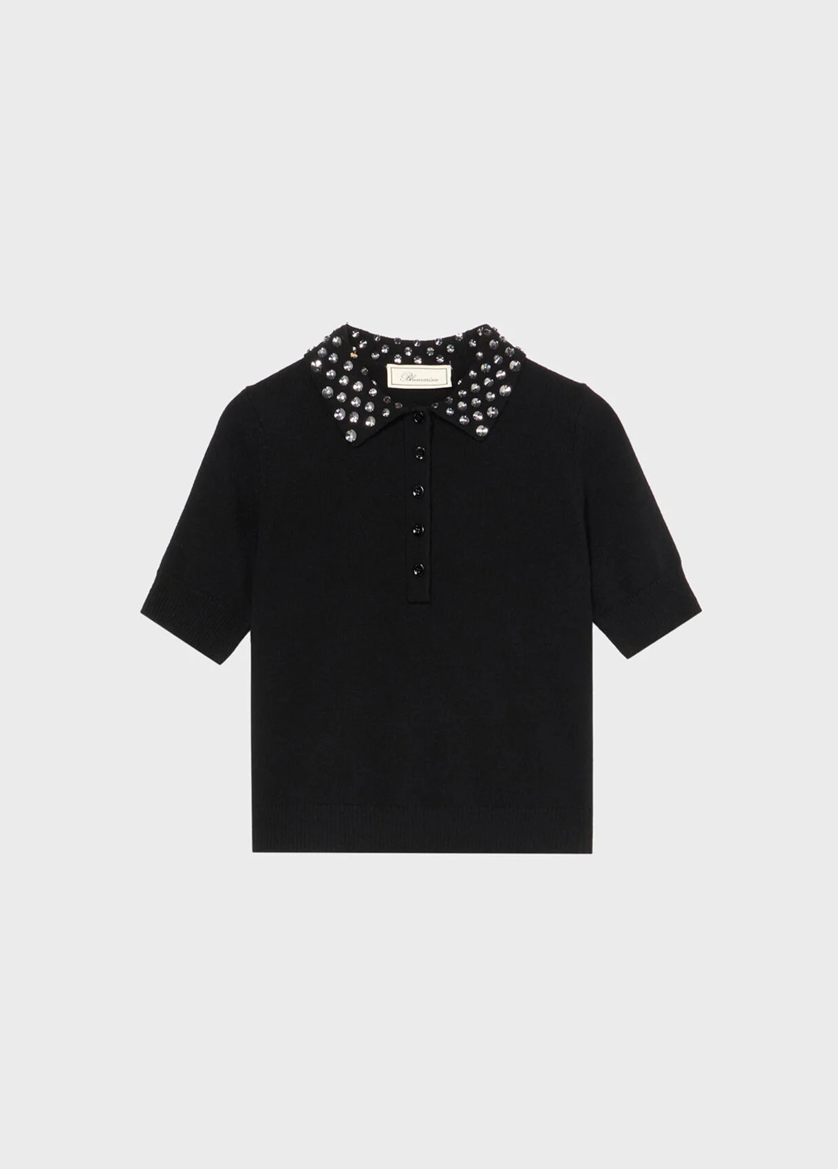 Short-sleeve polo shirt in smooth wool with hand-embroidered glass gemstones on the collar. - Stockinette stitch wool - Hand-embroidered glass gemstones on the collar - Polo shirt collar - Buttons - Short sleeves - Ribbed profiles - Regular fit DETAILS To find the correct size for you, please consult the Size Guide. Composition: Embroidery: 100% glass; Yarn 1: 100% wool Hand wash - room temperature; Do not bleach; Do not tumble dry; Iron at low temperature - no steam; Do not dry clean; Dry flat; Protect trims during wash; Wash inside out; Wash in mesh bag