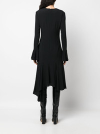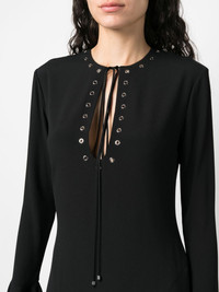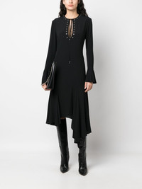 eyelet-detail asymmetric dress Highlights - Black - Silver-tone hardware - Metal eyelet detailing - Round neck - Front tie fastening - Concealed rear zip fastening - Long sleeves - Flared cuffs - Asymmetric hem - Mid-length Made in Italy Composition Outer: Acetate 55%, Silk 45% Lining: Polyester 100% SIZE & FIT Model measurements Height 5 ft 10 in(1.79 m) Bust/Chest 33.07 in(84 cm) Hips 35.82 in(91 cm) Waist 24.01 in(61 cm) FittingInformation Designed for a slim fit that sits just away from the body offering a close yet comfortable fit Made from a midweight non-stretch fabric This piece fits true to size – take your usual size