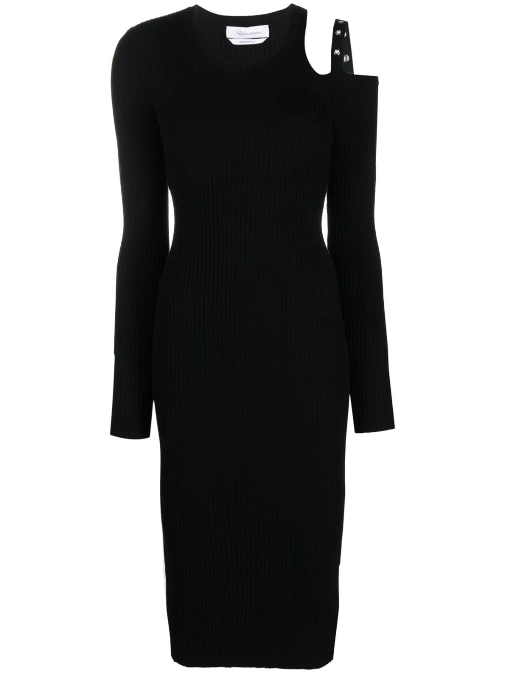 eyelet-embellished cut-out dress The eyelet-embellished strap that sits at the cut-out shoulder of this ribbed-knit Blumarine dress channels the label’s aughts inspirations. It draws the eye to the skin-baring detail, which juxtaposes demure long-sleeve silhouette. Highlights - Black - Ribbed knit - Cut-out detailing - Eyelet detailing - Round neck - Long sleeves - Mid-length Made in Italy Composition Viscose 72%, Polyester 28% SIZE & FIT Model measurements Height 5 ft 10 in(1.78 m) Bust/Chest 30.7 in(78 cm) Hips 34.64 in(88 cm) Waist 23.22 in(59 cm) FittingInformation Designed for a close fit throughout Made with a midweight knit, this piece offers some stretch This piece fits true to size – take your usual size