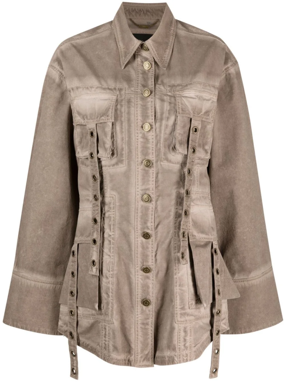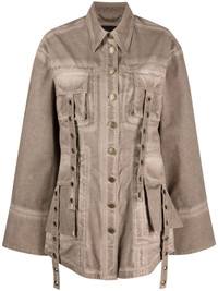 eyelet-embellished denim jacket This jacket spotlights Blumarine’s utilitarian inspiration for SS23. The faded brown construction is finished with eyelet-embellished straps and cargo pockets. Highlights - Light brown - Cotton blend - Eyelet detailing - Pointed flat collar - Front button fastening - Two chest flap pockets - Two side flap pockets - Long sleeves - Curved hem Imported Composition Cotton 97%, Spandex/Elastane 3% SIZE & FIT Model measurements Height 5 ft 10 in(1.77 m) Bust/Chest 32.67 in(83 cm) Hips 35.43 in(90 cm) Waist 23.62 in(60 cm) FittingInformation Designed for a slim fit that sits just away from the body offering a close yet comfortable fit Made from a midweight stretch fabric, this piece offers elasticity and flexibility when worn This piece fits true to size – take your usual size Washing instructions Machine Wash