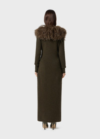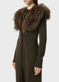 Long ribbed wool cardigan with cashmere goat fur collar and single-button closure. - Ribbed wool - Cashmere goat fur collar - Long sleeves - One-button closure - Ankle-length cut - Body-hugging fit - Made in Italy DETAILS To find the correct size for you, please consult the Size Guide. Composition: Main lining: 100% polyester; Padding (Fibres): 100% polyester; Yarn 1: 100% wool Do not wash; Do not bleach; Do not tumble dry; Iron at low temperature - no steam; Dry clean with tetrachloroethylene or hydrocarbons - gentle cycle; Protect buttons when dry cleaning; Remove detachable accessories before cleaning; Wash inside out