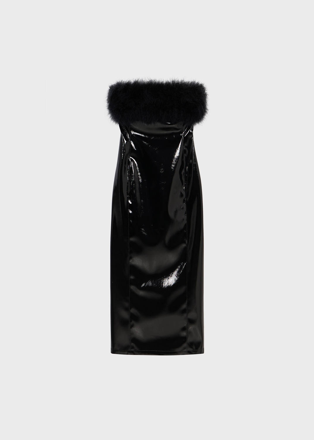 PENCIL SILHOUETTE FOR THIS SLEEVELESS PATENT MIDI DRESS WITH A YOKE IN DELICATE MARABOU FEATHERS, EXPOSED STITCHING, AND A SIDE SLIT. COMPOSITION: 68% PL 32% PU - PATENT FINISH - PENCIL STYLE - MARABOU FEATHER YOKE - SLEEVELESS CUT - EXPOSED SEAMS - SIDE VENT - MIDI-LENGTH - REGULAR FIT DETAILS COLORS: BLACK