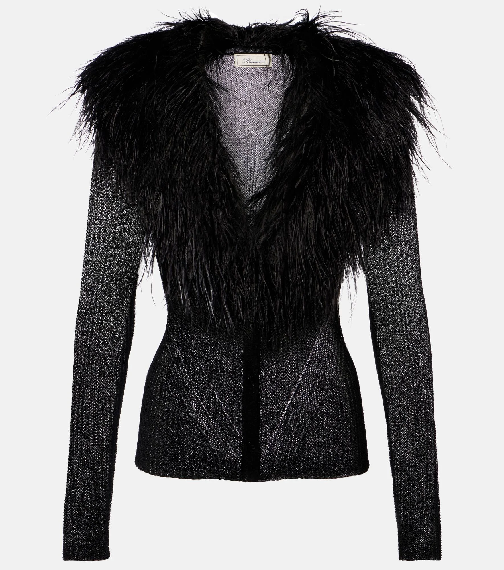 Blumarine captures the opulence of the '00s, contemporizing the Y2K aesthetic for a modern audience. This cardigan is ribbed-knit for a close fit and features detachable ostrich feather trims at the collar. Product Details - Material: 76% viscose, 24% polyamide - Care instructions: hand wash - Made in China - Color: black - Designer color name: Black - Item color: black - Contains non-textile parts of animal origin - Closure: buttoned front - Detachable collar - Item number: P01137436 Size & Fit - True to size - Semi-sheer - Fitted - Stretchy fabric - Falls to the hip - The model seen in the picture is 178cm-5'10" and wearing a size XS