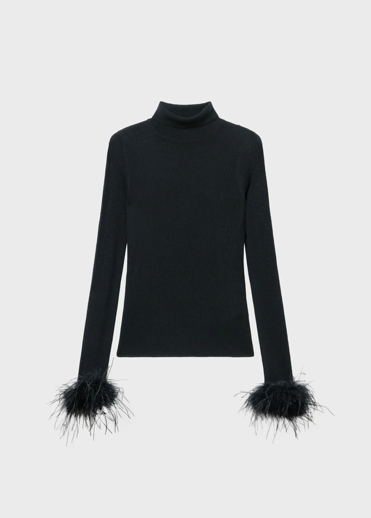 Turtleneck sweater in ribbed wool with long sleeves and feather-trimmed cuffs. - Ribbed wool - High neckline - Long sleeves - Feather-trimmed cuffs - Body-hugging fit DETAILS To find the correct size for you, please consult the Size Guide. Composition: Yarn 1: 100% wool Do not wash; Do not bleach; Do not tumble dry; Iron at low temperature - no steam; Dry clean with tetrachloroethylene or hydrocarbons - gentle cycle; Wash inside out