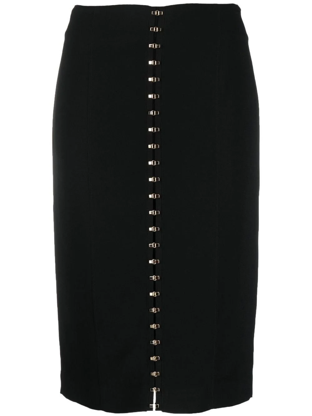 fitted knit skirt black knitted construction high waist front hook and eye fastening stretch-design Made in Italy Composition Outer: Viscose 53%, Acetate 44%, Spandex/Elastane 3% Lining: Polyester 100% SIZE & FIT Model measurements Height 5 ft 9 in(1.75 m) Bust/Chest 32.67 in(83 cm) Hips 36.22 in(92 cm) Waist 24.8 in(63 cm) FittingInformation This piece fits true to size. We recommend you get your regular size Cut for a slim fit Made with a mid-weight fabric