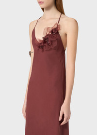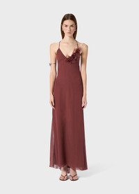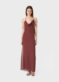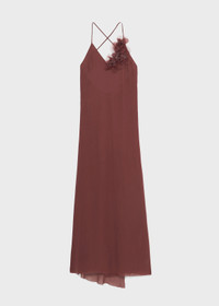 GEORGETTE SLIP DRESS WITH HANDMADE 3D FLOWER DETAIL. COMPOSITION: 100%PL - GEORGETTE - STRAIGHT LINE - V-NECKLINE WITH A HANDCRAFTED 3D FLOWER DECORATION - THIN CRISSCROSS STRAPS AT THE BACK - SLEEVELESS CUT - DEEP ROUND NECKLINE AT BACK - ASYMMETRIC BOTTOM - FULLY LINED - FLOOR-LENGTH - REGULAR FIT DETAILS COLORS: BROWN