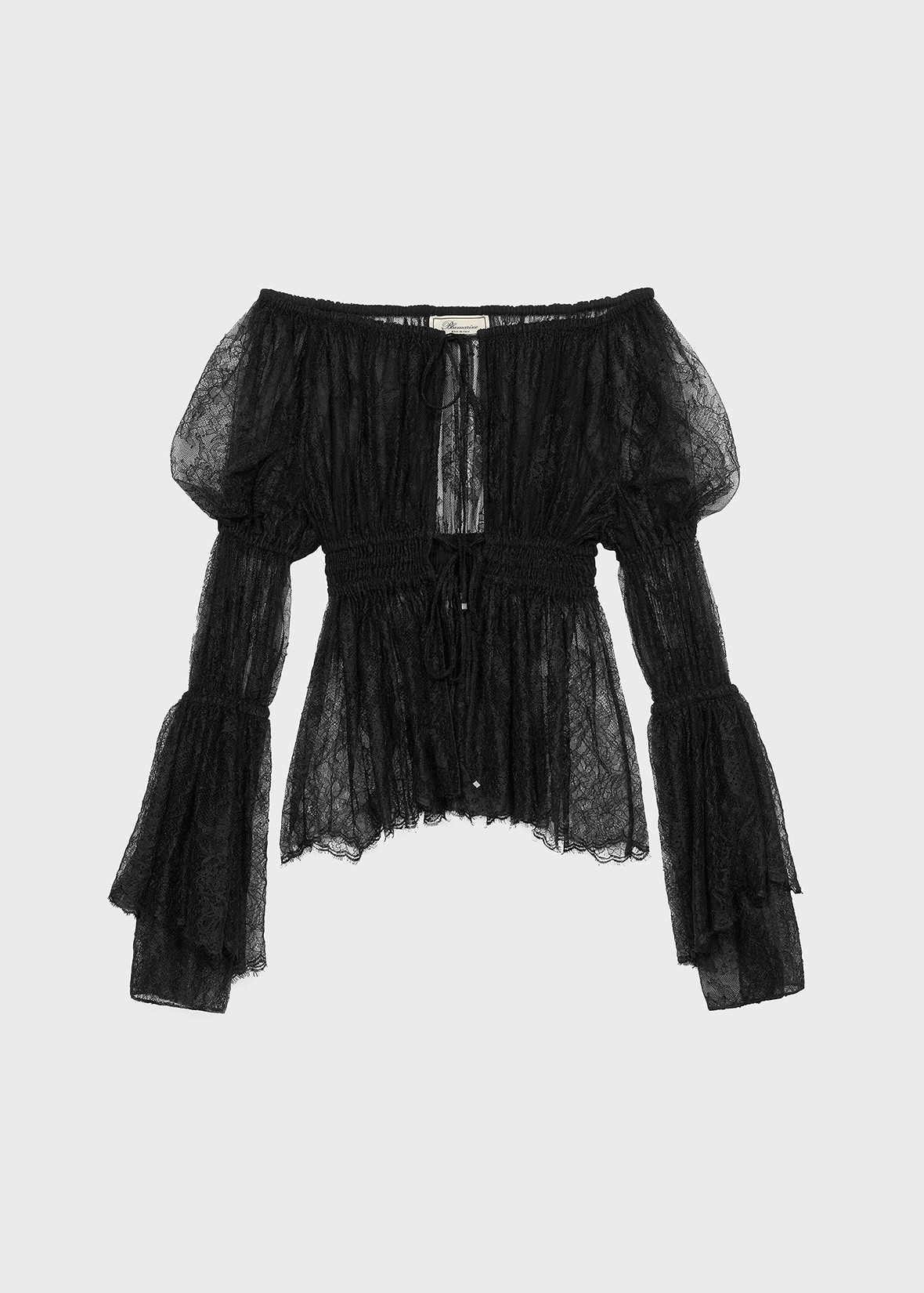 CHANTILLY STRETCH LACE SHIRT WITH GATHERED DETAILS AT THE WAIST AND ON THE SLEEVES, TIE CLOSURE. COMPOSITION: 50%PA 50%VI - CHANTILLY STRETCH LACE - HONEYCOMB GATHERED DETAIL AT THE WAIST AND ON THE SLEEVES - WIDE NECKLINE THAT CAN ALSO BE OFF-SHOULDER - TIE CLOSURE - LONG PUFF SLEEVES - RUFFLED CUFFS - INNER LINING - REGULAR FIT DETAILS COLORS: BLACK
