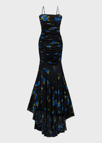 A BOLD ANIMALIER PRINT FOR THE LONG SECOND SKIN JERSEY DRESS WITH RUFFLES ON THE BODICE AND A FULL SKIRT WITH DIAGONAL RUFFLES. COMPOSITION: 90%PA 10%EA - SECOND SKIN JERSEY - ANIMALIER PRINT - STRAIGHT NECKLINE - SLEEVELESS CUT - SHOULDER PADS - RUFFLED BODICE - FULL SKIRT WITH DIAGONAL RUFFLES - LOW-CUT BACK - ZIP CLOSURE AT BACK - FULLY LINED - FLOOR-LENGTH - BODY-HUGGING FIT DETAILS COLORS: BLUE