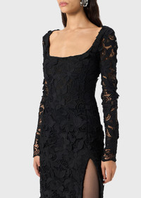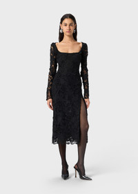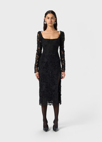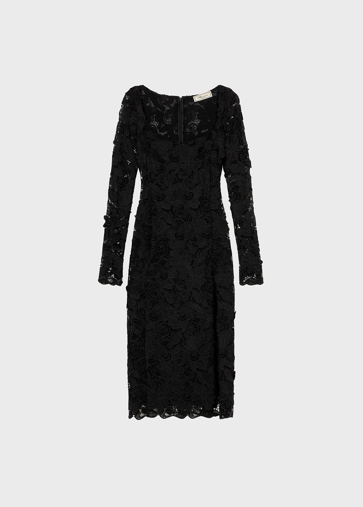 LONG SHEER SLEEVES FOR THE MIDI DRESS IN MACRAME LACE WITH SQUARE NECKLINE AND SIDE SLIT. COMPOSITION: 100%PL LINING 100%PL - MACRAME LACE - SQUARE NECKLINE - LONG SHEER SLEEVES - SIDE SLIT - ZIP CLOSURE AT THE BACK - INNER LINING - MIDI LENGTH - REGULAR FIT DETAILS COLORS: BLACK