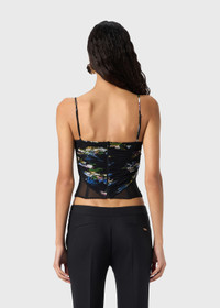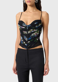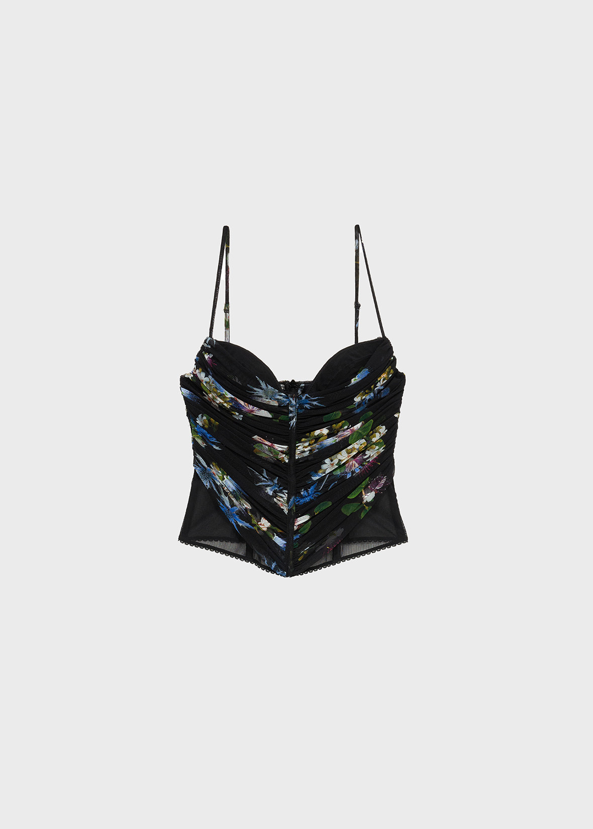 TOP IN PRINTED TULLE BOUQUET WITH GATHERED DOUBLE CUPS ON A BUSTIER WITH SHAPED CUPS AND BONING. COMPOSITION: 94%PA 6%EA - PRINTED BOUQUET TULLE WITH GATHERING - STRETCH SATIN - SLEEVELESS - STRAPS - SHAPED CUPS - LACE TRIM PROFILES - ZIP CLOSURE AT THE BACK - INTERNAL LINING - BODYCON FIT DETAILS COLORS: BLACK, BLUE