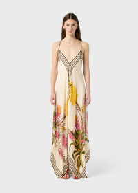 Long dress with straps that join on the back, made with a matching printed viscose twill scarf. - Viscose twill - Agave flower print - Matching scarves - Sleeveless - Shoulder straps joined on the back - Rear neckline - V-neckline - Asymmetrical hem - Loose fit - Made in Italy DETAILS Composition: External fabric: 100% Viscose Gentle wash at max 30°C; Do not bleach; Do not tumble dry; Iron at low temperature - no steam; Dry clean with tetrachloroethylene or hydrocarbons - gentle cycle; Use a mild detergent; Wash inside out; Gentle spin cycle; Iron inside out