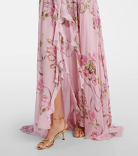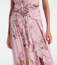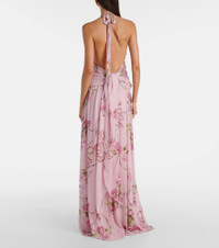 This floral maxi dress from Blumarine is crafted from airy georgette, featuring a scalloped V-neckline and a ruffled belt that gracefully cascades down the skirt. Adorned with a delicate flower accent, this piece exudes romantic charm. Product Details - Material: 100% viscose - Care instructions: machine wash at 30 degrees - Made in Italy - Designer color name: Rosa/Mauve Orchid - Item color: pink - Lining: 100% polyester - Self-tie neck and back - Hem: uneven - Closure: zipped back - Item number: P01058453 Size & Fit - Fits large to size - we recommend trying one size smaller - Low back - Cinched waist - Non-stretchy fabric - The model seen in the picture is 178cm-5'10" and wearing a size IT 38