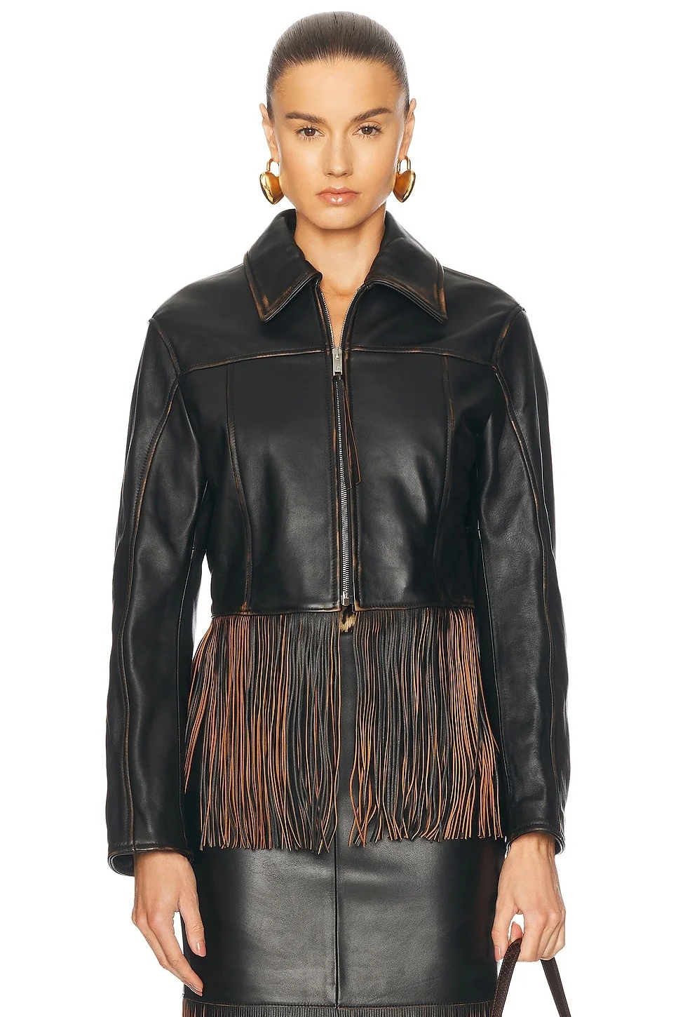 Details - Self: 100% leather - Lining: 100% cotton - Made in Italy - Professional leather clean only - Front zip closure - Fringed hem - Heavyweight leather fabric - Item not sold as a set - Our Style No. BMAF-WO12 - Manufacturer Style No. P522L081A