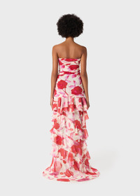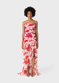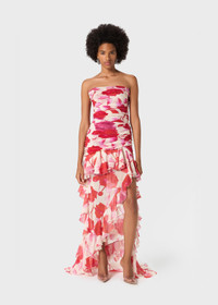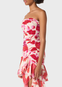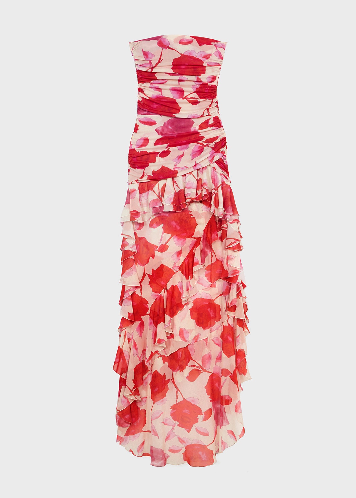 PRINTED JERSEY BUSTIER DRESS WITH CHIFFON FLOUNCES