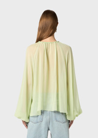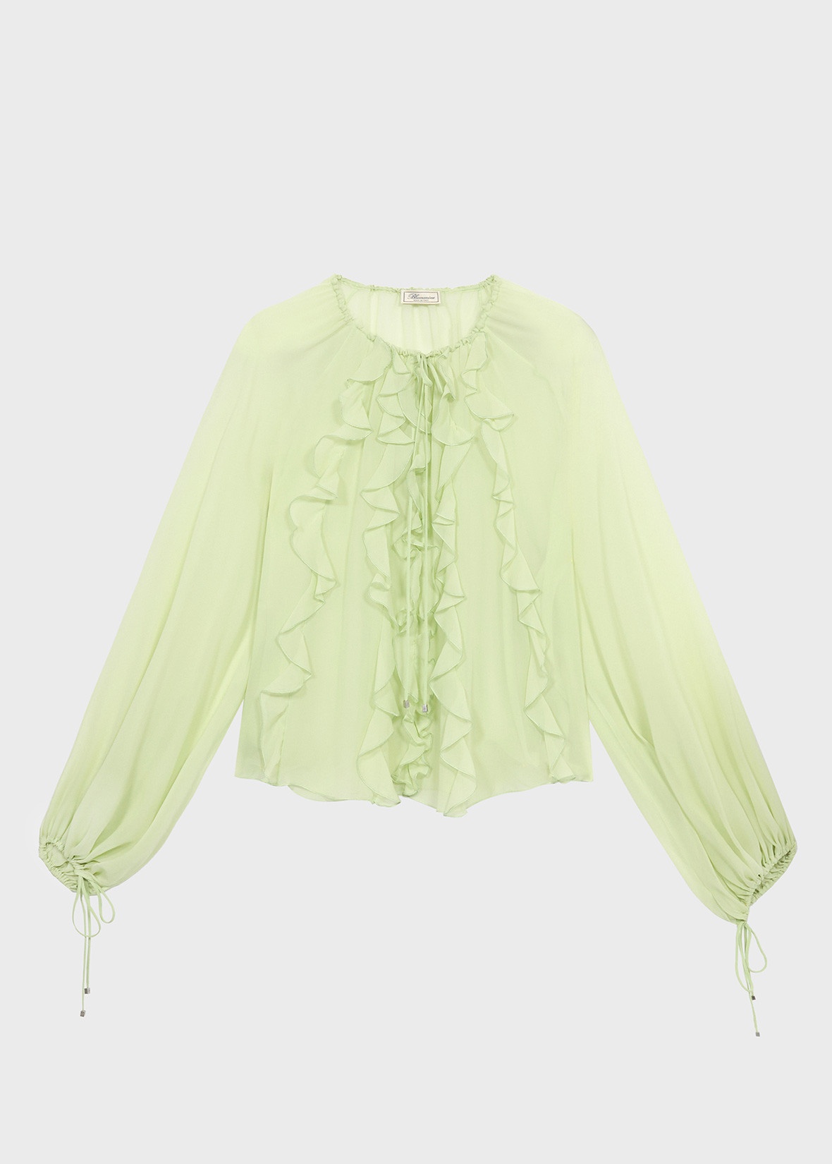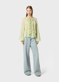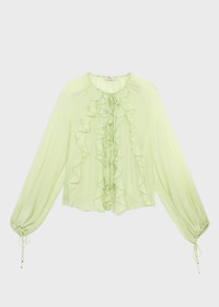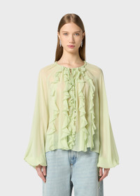 LIGHT RUFFLES ARE APPLIED TO THE BODICE OF THIS SILK GEORGETTE SEE-THROUGH BLOUSE WITH TIES. COMPOSITION: 100% SILK - SEE-THROUGH EFFECT SILK GEORGETTE - RUFFLED FRONT - ROUND NECKLINE WITH DRAWSTRING - FLARED LONG SLEEVES CINCHED AT THE CUFFS - LOOSE FIT DETAILS COLORS: GREEN