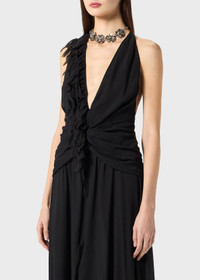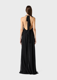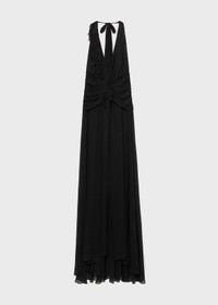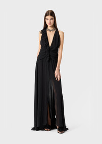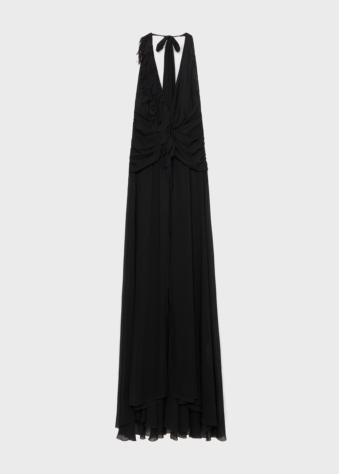 LONG GEORGETTE DRESS WITH LASER-CUT PETAL DECORATIONS AT THE NECKLINE. DRAPED SASHES AT THE HIPS TO TIE AT THE BACK. COMPOSITION: 100%PL - GEORGETTE - V-NECKLINE WITH A LASER-CUT PETAL TRIM - DROPPED SHOULDERS - SLEEVELESS CUT - DRAPED HIPS - FRONT VENT - OPEN BACK WITH SASHES TI TIE IN A BOW - FULLY LINED - ASYMMETRIC BOTTOM - FLOOR-LENGTH - REGULAR FIT DETAILS COLORS: BLACK