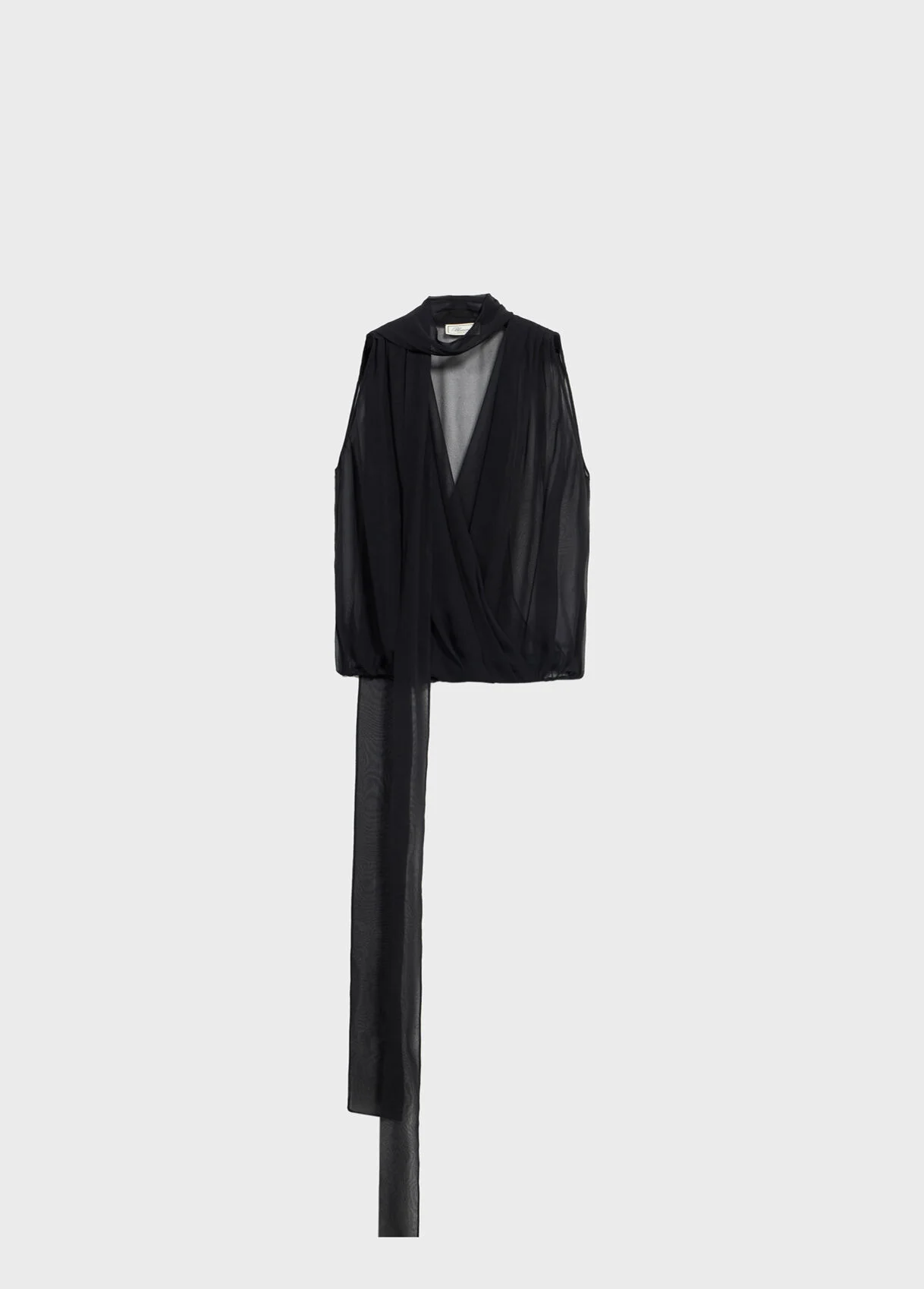 Viscose georgette wrap top with a V-neck, a pussy-bow and a blouson fit. - Viscose georgette - Blouson cut - Sleeveless - Wrap front - Deep V-neckline - Pussy-bow neck - Pleated shoulder straps - Elasticated at the bottom - Loose fit - Made in Italy DETAILS Composition: External fabric: 100% Viscose Do not wash; Do not bleach; Do not tumble dry; Iron at low temperature - without steam; Dry clean with tetrachloroethylene or hydrocarbons - gentle cycle; Wash inside out; Wash in a mesh bag; Iron inside out