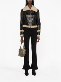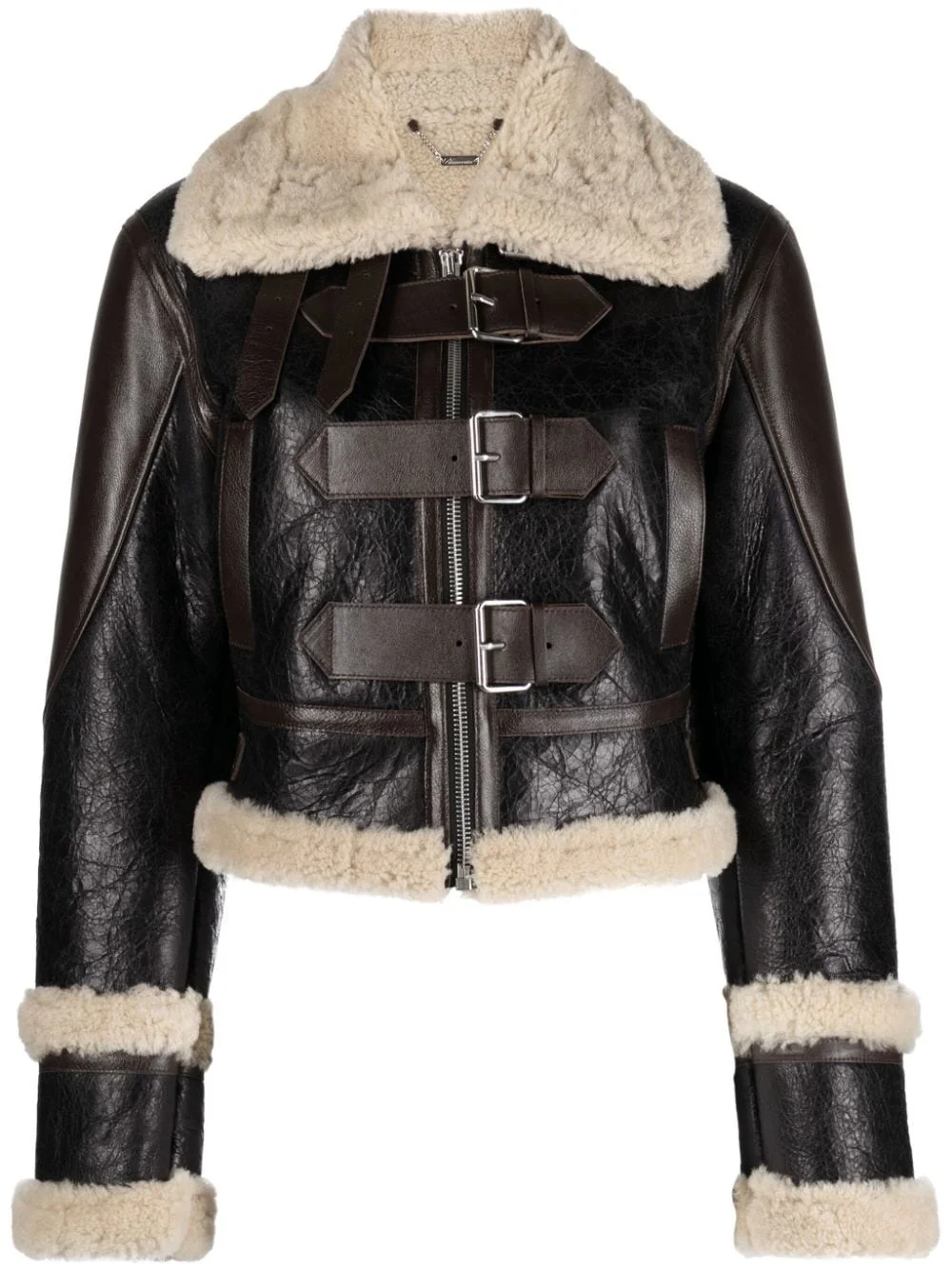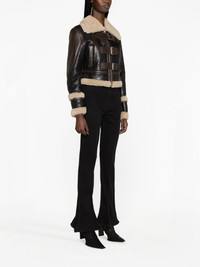 Giacca shearling-trim leather jacket Blumarine’s jacket is characterised by the contrast shearling trim and oversized buckle fastenings that riff on classic flying styles. The supple leather construction is overlaid with contrasting panels. Highlights - Black/dark brown - Calf leather - Shearling lining - Panelled design - Contrasting trim - Contrasting collar - Front zip fastening - Front buckle fastening - Long sleeves - Two side welt pockets - Adjustable side straps - Cropped - Straight hem Made in Italy Composition Outer: Sheep Skin/Shearling 100%, Calf Leather 100% Lining: Sheep Skin/Shearling 100%, Cotton 100% SIZE & FIT Measurement CHEST 38.58 in(98 cm) LENGTH 19.68 in(50 cm) SLEEVE LENGTH 25.59 in(65 cm) Washing instructions Specialist Cleaning