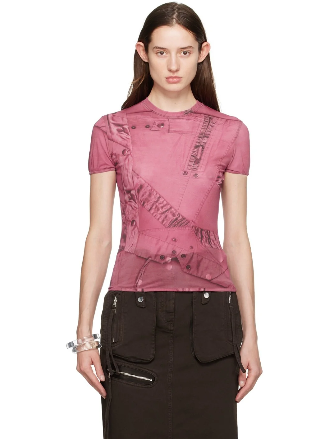 Semi-sheer stretch nylon jersey T-shirt. Trompe l'œil pattern printed throughout. · Crewneck · Elasticized trim at hem and cuffs Supplier color: Geranio/Nero 90% polyamide, 10% elastane. Made in Italy 241901F110016