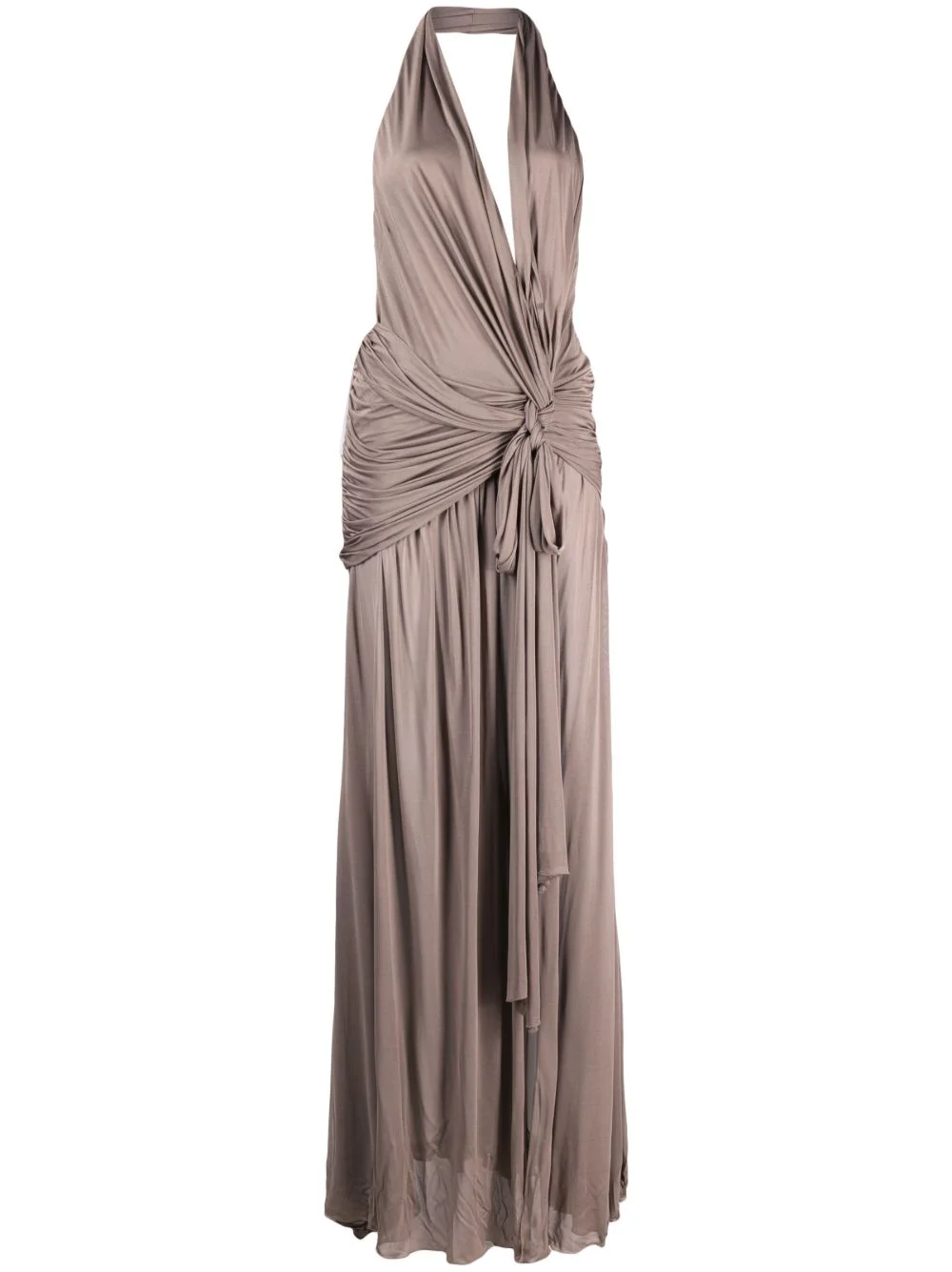 halterneck backless gown Cut in Italy for a celebratory floor-length, this draped gown from Blue Marine is defined by its plunging halterneck that exposes the torso whilst falling fluidly into a fluted skirt. Highlights - Taupe brown - Fully draped - Halterneck - Plunging v-neck - Backless - Tied waist - Curved hem - Floor-length Made in Italy Composition Outer: Viscose 100% Lining: Polyamide 73%, Elastane 27% SIZE & FIT Model measurements Height 5 ft 10 in(1.79 m) Bust/Chest 33.07 in(84 cm) Hips 35.82 in(91 cm) Waist 24.01 in(61 cm) FittingInformation Designed for a slim fit that sits just away from the body offering a close yet comfortable fit Made from a midweight non-stretch fabric, this piece offers minimal elasticity when worn This piece fits true to size – take your usual size