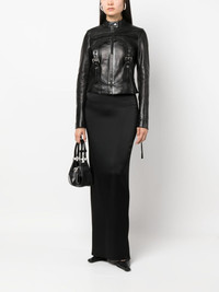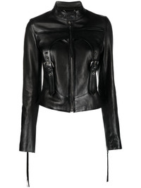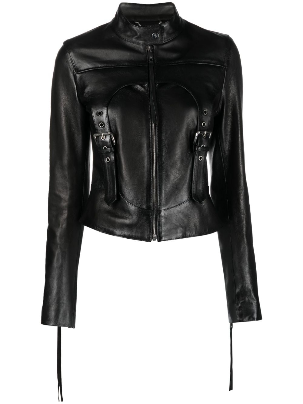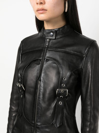 harness-detail leather jacket Highlights - Black - Lambskin - Decorative buckle detail - Band collar - Front zip fastening - Long sleeves - Straight hem Composition Lining: Viscose 57%, Polyester 23% Outer: Lamb Skin 100% SIZE & FIT Model measurements Height 5 ft 10 in(1.78 m) Bust/Chest 30.7 in(78 cm) Hips 36.2 in(92 cm) Waist 25.6 in(65 cm) FittingInformation Designed for a slim fit that sits just away from the body offering a close yet comfortable fit Sturdy and hard-wearing, this denim piece offers no stretch This piece fits true to size – take your usual size