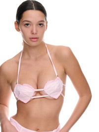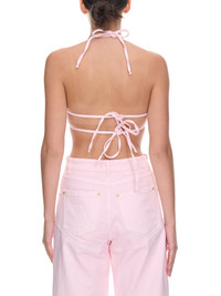 BLUMARINE top in pink, patchwork heart bra design, halter neck, spaghetti straps, logo rivets, embroidered & frayed details, gold-tone hardware, self-tie, adjustable fit. Made in Italy One Size 98% Cotton, 2% Elastane Model is 5'9" wearing size OS. Bust: 32" Waist: 24" Hip: 35.5"