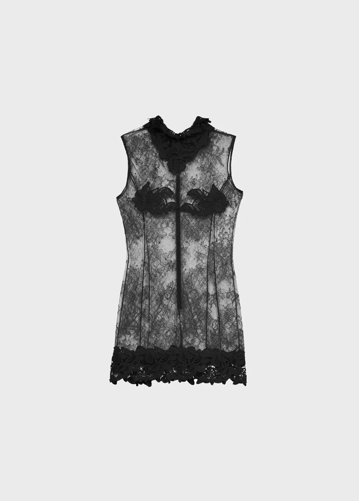 lingerie inspiration for the short dress made of see-through chantilly lace with macrame lace applications on the decollete, on the cups, and at the bottom. - See-through chantilly lace - Macrame lace applications - Sleeveless - Zip closure at the back - Removable underdress - Mini length - Regular fit - Made in Italy DETAILS To find the correct size for you, please consult the Size Guide. Composition: Main fabric: 50% polyamide, 50% viscose; Trimmings: 100% polyester; Slip: 100% polyester Do not wash; Do not bleach; Do not tumble dry; Iron at low temperature - no steam; Dry clean with tetrachloroethylene or hydrocarbons - gentle cycle; Clean inside out; Iron inside out