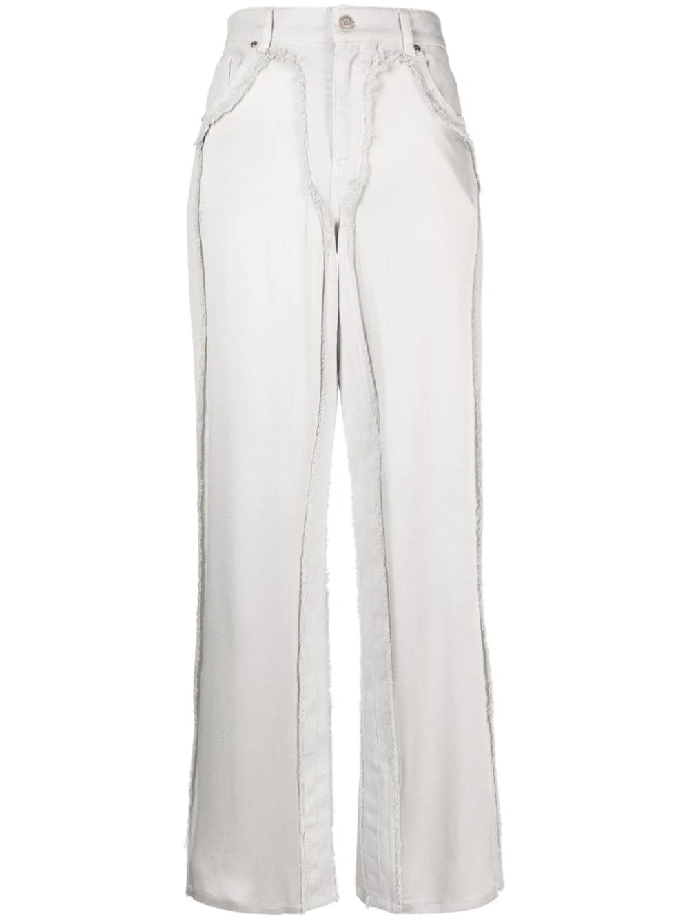 high-waist satin-panelled jeans Blumarine showcases it ability to tastefully blend juxtaposing aesthetics with these wide-leg jeans. They're elevated by satin panelling at the front and rear bordered by tactile fringing that adds a rugged appeal. Highlights - Light grey - Cotton - Satin panels - High waist - Unfinished effect - Concealed fly and button fastening - Belt loops - Classic five pockets - Straight hem - Wide leg Imported Composition Outer: Acetate 55%, Silk 45% Lining: Cotton 100% SIZE & FIT Model measurements Height 5 ft 11 in(1.8 m) Bust/Chest 31.49 in(80 cm) Hips 36.22 in(92 cm) Waist 25.59 in(65 cm) FittingInformation Designed with a wide leg cut, these jeans allow for a close fit at the waist and offer a loose and roomy fit over the leg