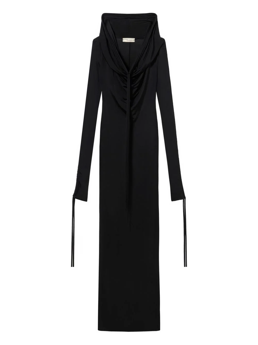 hooded maxi dress Highlights - Black - Hooded neck - Drawstrings cuffs - Long sleeves - Front ruching - Maxi length Made in Italy Composition Viscose 93%, Elastane 7% Washing instructions Hand Wash