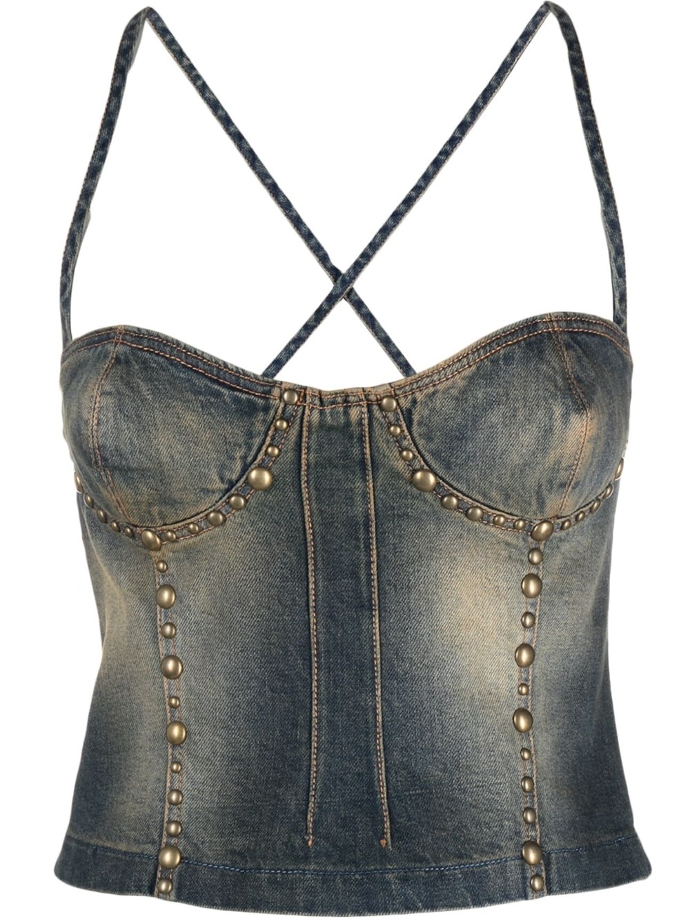 Jean denim tank top Blumarine's bold design style is evident in this tank top. Boasting a washed denim construction, it is embellished with studs and crossed straps for a daring look. Highlights - Navy blue - Stretch-cotton - Denim - Bleach wash - Panelled bodice - Bronze-tone stud embellishment - Sweetheart neck - Thin straps - Sleeveless - Rear criss-cross straps - Rear zip fastening - Cropped Imported Composition Outer: Cotton 98%, Spandex/Elastane 2% Lining: Polyester 65%, Cotton 35% SIZE & FIT Model measurements Height 5 ft 10 in(1.78 m) Bust/Chest 32.7 in(83 cm) Hips 34.3 in(87 cm) Waist 24.4 in(62 cm) FittingInformation Designed for a close fit throughout Made from a midweight stretch fabric, this piece offers elasticity and flexibility when worn This piece fits true to size – take your usual size