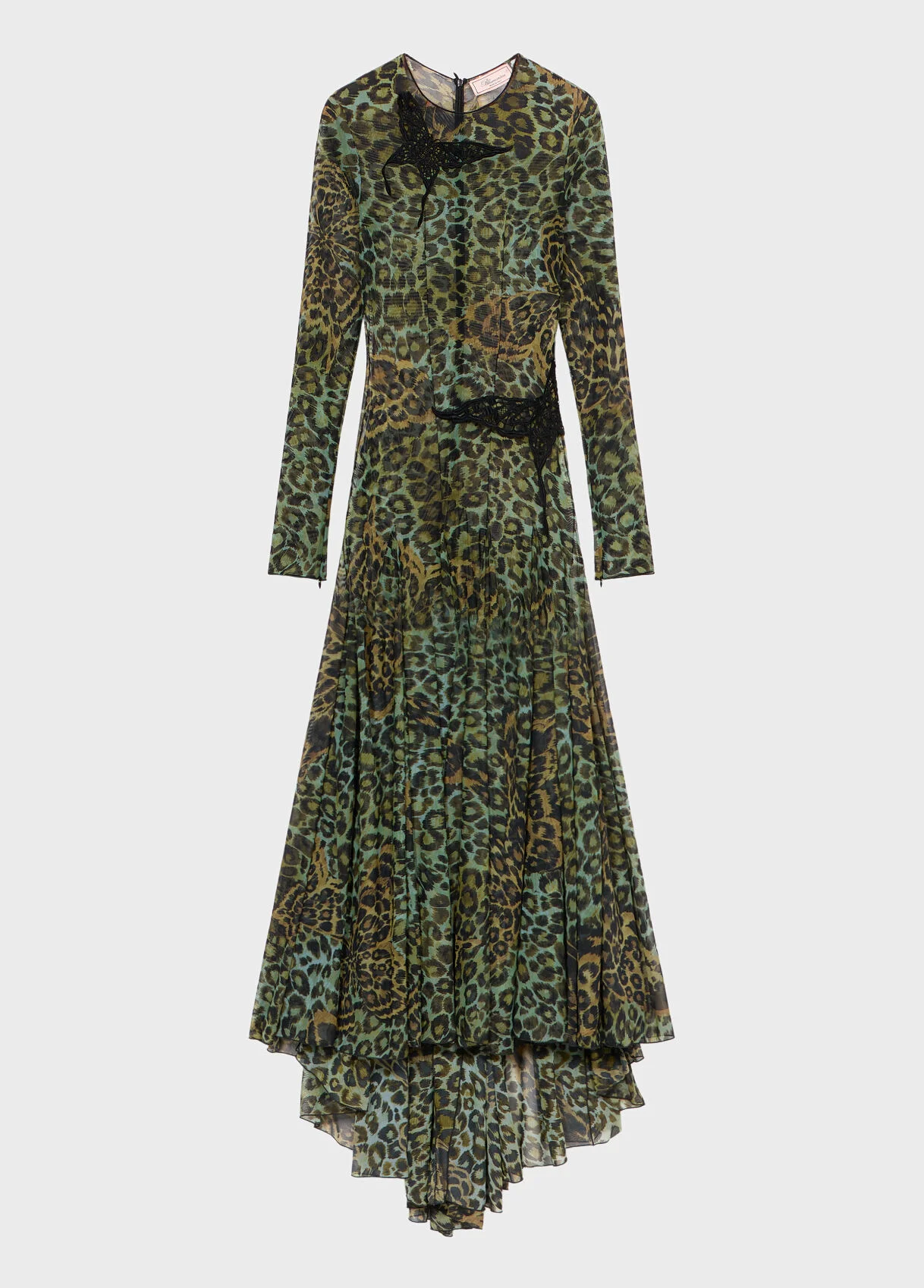 Long dress in second skin jersey with animal print and macrame butterfly embroidery, featuring a wavy skirt and a short train at the back. - Second skin jersey - Animal print - Macrame butterfly embroidery - Round neckline - Long sleeves - Wavy skirt - Short train at the back - Back zip closure - Removable slip - Floor length - Regular fit DETAILS To find the correct size for you, please consult the Size Guide. Composition: Main fabric: 80% Polyamide, 20% Elastane | Patch: 95% Cotton, 5% Polyester | Slip: 75% Polyamide, 25% Elastane. Gently wash at max 30°C; Do not bleach; Do not tumble dry; Iron at low temperature - no steam; Do not dry clean; Use neutral detergent; Wash inside out; Gentle spin; Wash in a mesh bag; Iron inside out.