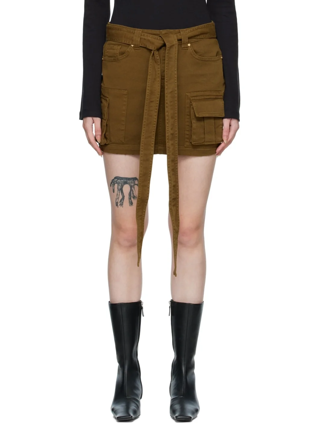 Stretch denim skirt. · Detachable self-tie belt · Five-pocket styling · Flap pockets at front · Leather logo patch and gold-tone logo plaque at back waistband · Zip-fly Supplier color: Oil 98% cotton, 2% spandex. Made in Albania 222901F090014