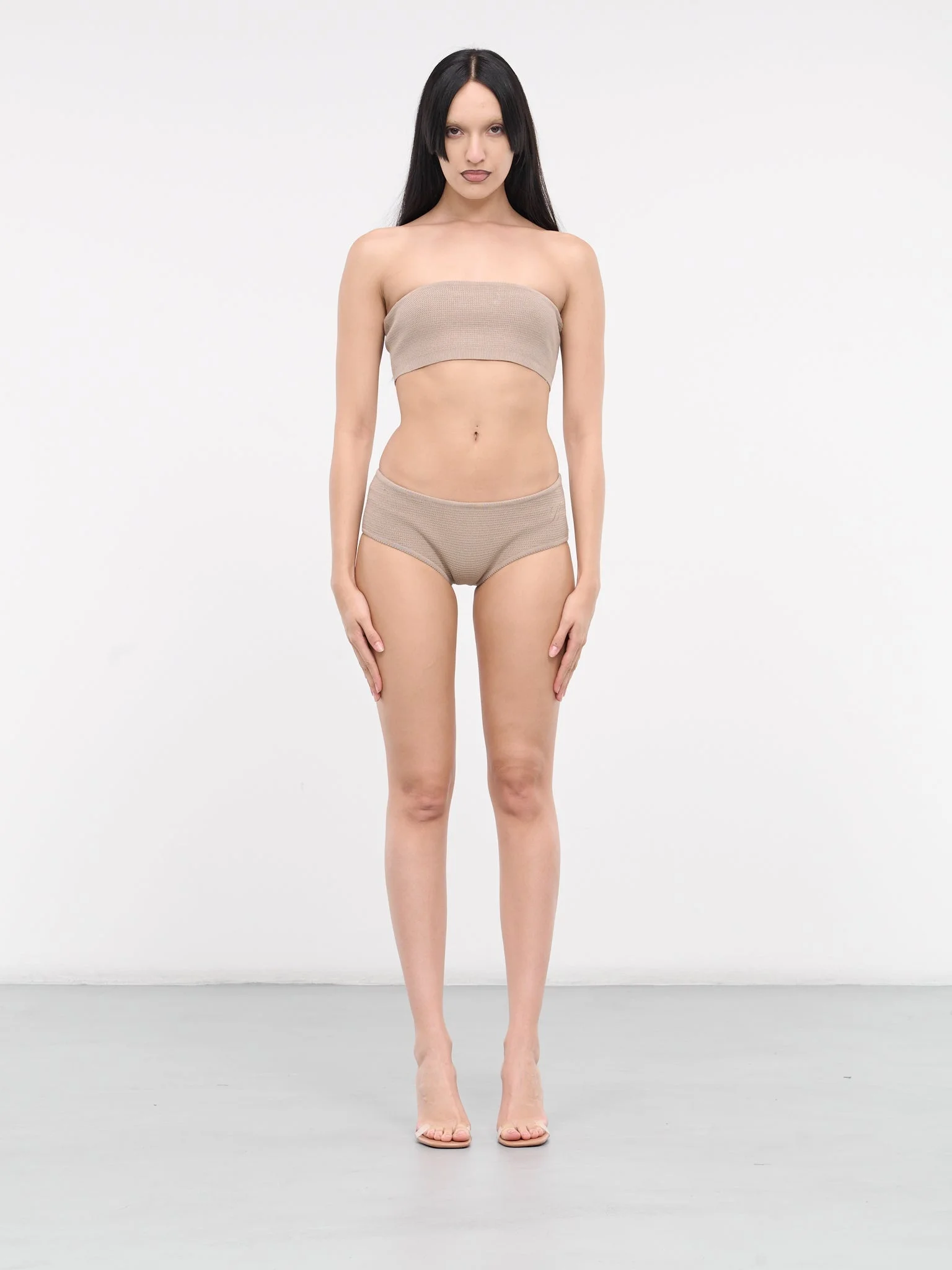 BLUMARINE top & bottom set in sandy grey, viscose-poly blend, paneled construction, strapless tube top & mini-length shorts. Made in Italy Top: 70% Viscose 30% Polyester Bottom: 70% Viscose 30% Polyester Standard Sizing Model is 5'8" wearing size XS. Bust: 32" Waist: 26" Hips: 34.5"