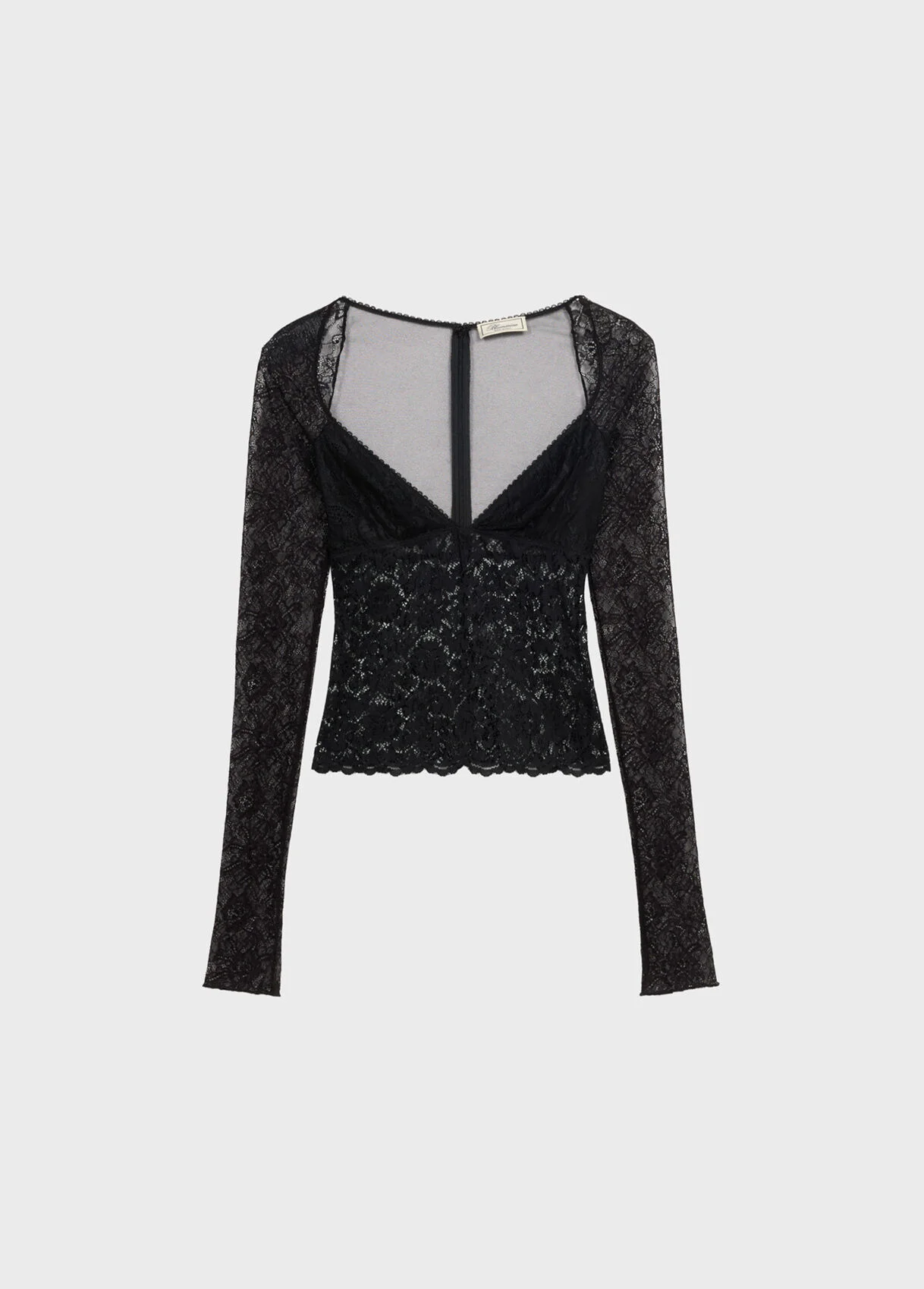 See-through lace blouse with sweetheart neckline, lined cups in fabric, long sleeves, and tulle back. - See-through lace - Sweetheart neckline with trimming - Fabric lined cuffs - Long sleeves - Tulle back - Zip closure at back - Body-hugging fit - Made in Italy DETAILS To find the correct size for you, please consult the Size Guide. Composition: Main lining: 75% polyamide, 25% elastane; Trimming: 80% polyamide, 20% elastane; Lace: 80% polyamide, 20% elastane; Tulle: 90% polyamide, 10% elastane; Lace 2: 50% polyamide, 50% viscose Do not wash; Do not bleach; Do not tumble dry; Iron at low temperature - no steam; Dry clean with tetrachloroethylene or hydrocarbons - gentle cycle; Wash inside out; Do not iron lining; Iron inside out