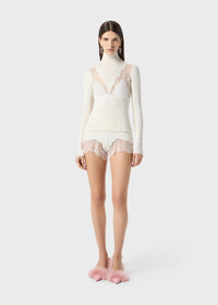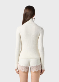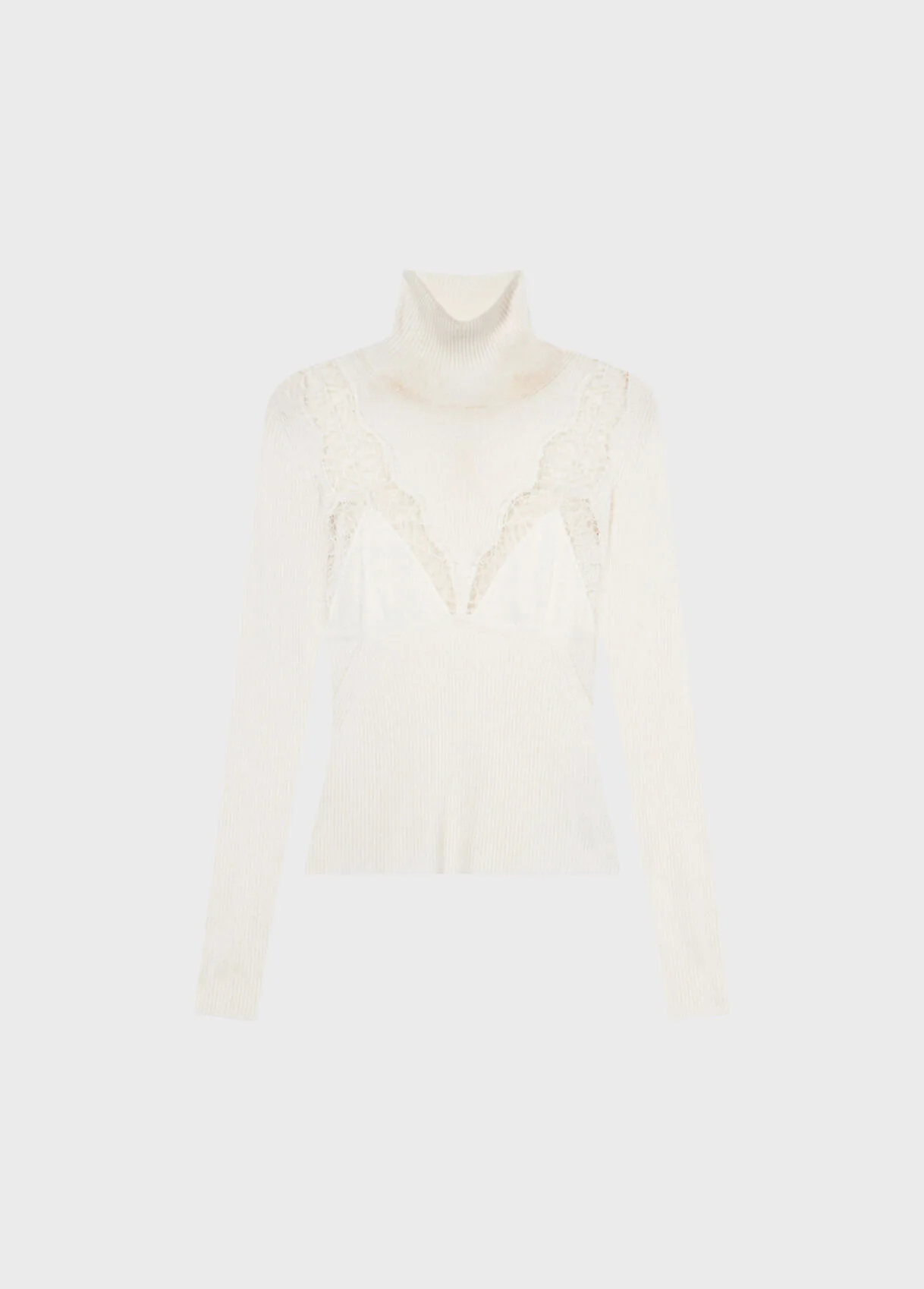 Turtleneck sweater in stretch ribbed wool with lace and satin inserts creating a trompe-l’œil bra effect. - Stretch wool-blend rib - High neckline - Lace and satin inserts creating a trompe-l’œil bra effect - Long sleeves - Body-hugging fit - Made in Italy DETAILS To find the correct size for you, please consult the Size Guide. Composition: Main fabric: 100% polyester; Main lining: 100% polyester; Yarn 1: 87% wool, 10% polyamide, 3% elastane; Lace: 100% polyamide Do not wash; Do not bleach; Do not tumble dry; Iron at low temperature - no steam; Dry clean with tetrachloroethylene or hydrocarbons - gentle cycle; Wash inside out; Wash in a mesh bag