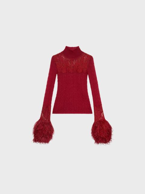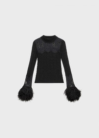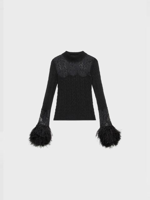HOLE KNIT SWEATER WITH LACE YOKE AND MARABOU TRIMMED CUFFS. COMPOSITION: 50% PA 46% WM 4% WO - COMPOSITION: MIXED WOOL HOLE YARN - HIGH RIBBED NECK - LACE YOKE WITH FRINGE - LONG SLEEVES WITH LACE TRIM - MARABOU TRIMMED CUFFS - BODY FIT DETAILS COLORS: BLACK