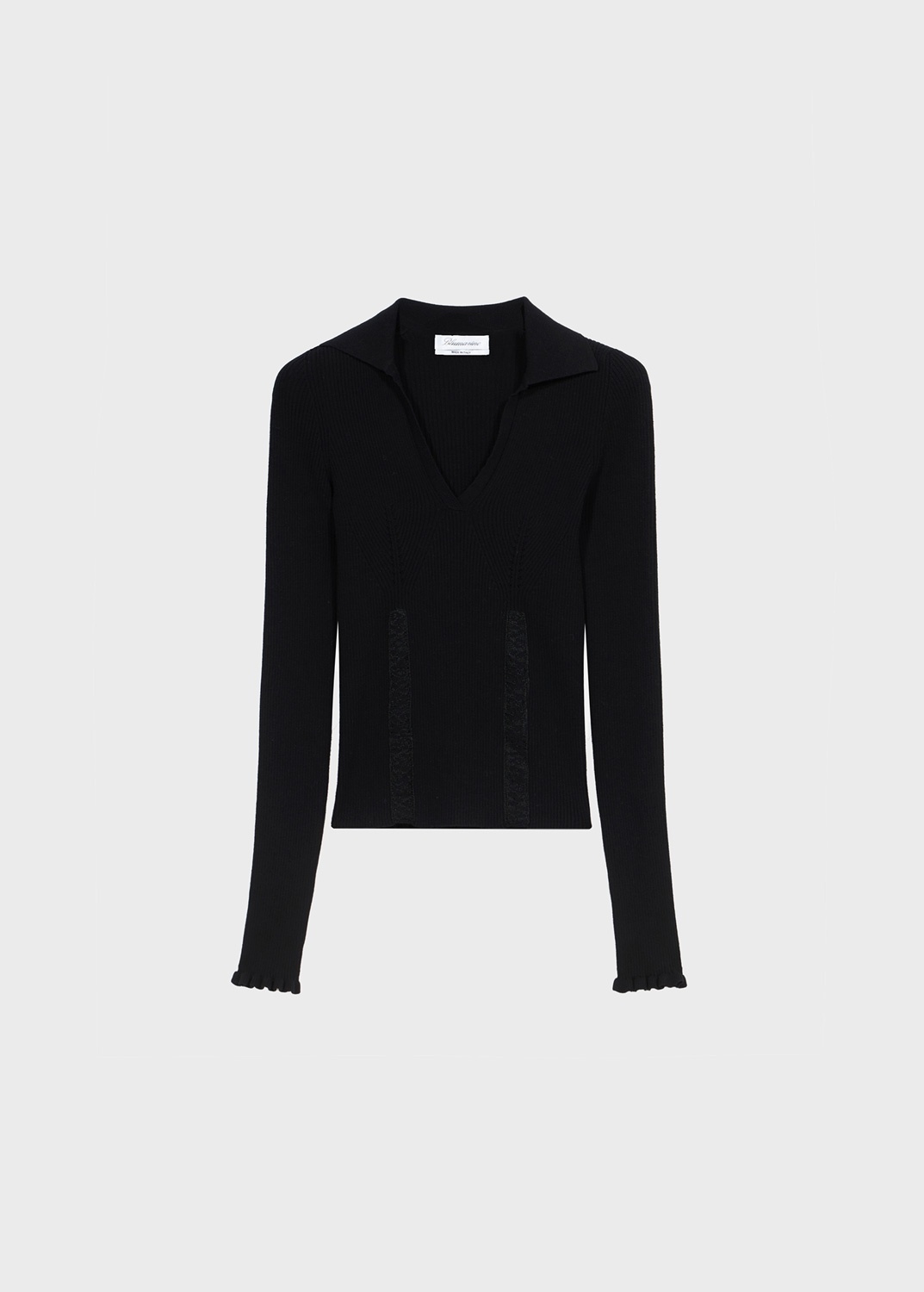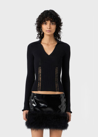 LACE INSERTS ADD FEMININITY FOR THIS RIBBED KNIT TOP WITH A V-NECK COLLAR AND OPENWORK PATTERN. COMPOSITION: 69% VI 29% PL 2% PA - RIBBED SWEATER - COLLAR - V-NECK - LACE INSERTS - OPENWORK - LONG SLEEVES - REGULAR FIT DETAILS COLORS: BLACK